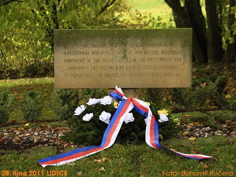 U potoka se tu pod košatým stromem krčí pomníček padlým v I. světové válce. Byl tu i ve starých Lidicích a na něm, kromě busty Jana Husa, 16 jmen lidických mužů, kteří ve válce, kterou nazýváme „první“, padli. Dlouho se nevědělo, jaká jména tam vlastně byla, ale podařilo se to zjistit panu Antonínu Nešporovi. Jejich jména přečetl pan Skála a já jsem se připojil s přečtením několika zápisů pana faráře Josefa Štemberky, které učinil do farní kroniky právě v roce 1918 (to zase „vypátral“ pan Bohumil Kučera).