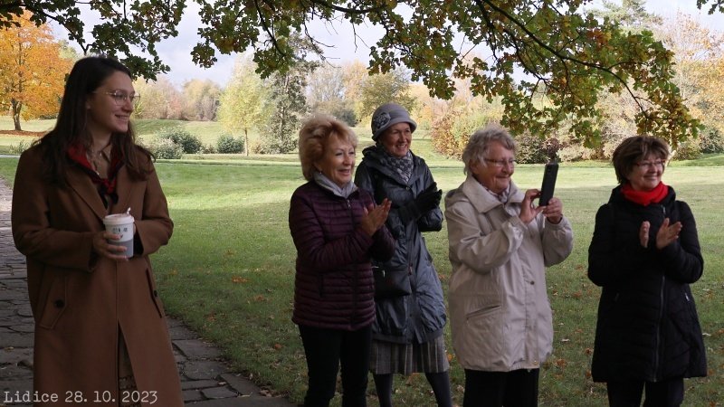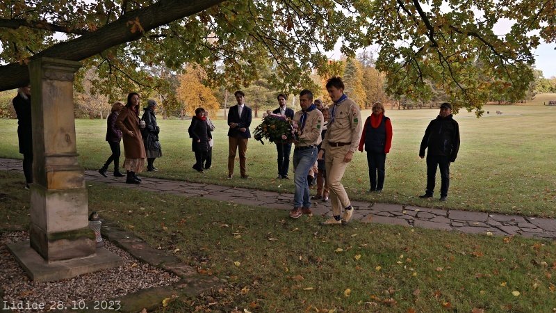 Stalo se tradicí, že u příležitosti státního svátku Vzniku Československého státu, 28. října, občané Lidic uctí památku padlých a také si uvědomí svou státnost právě zde. Místostarosta obce Lidice pan Tomáš Skála přednesl krátký, ale velmi věcný projev zmiňující současnou složitou situaci ve světě. Poté předal slovo předsedkyni spolku LIDICE MEMORY Ing. Haně Pokorné, která jeho slova dále doplnila.