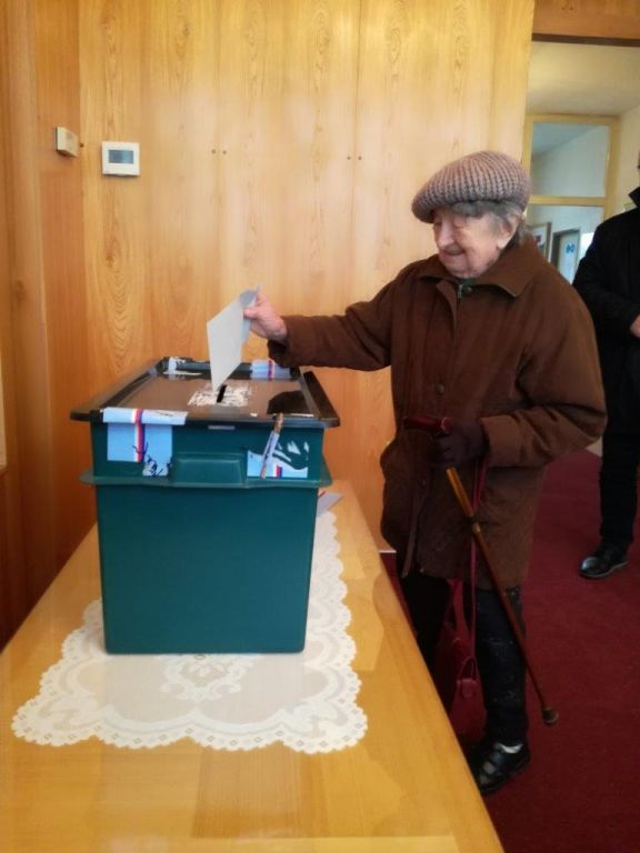 Na fotografii je zachycena nejstarší volička obce Lidice paní Miloslava Kalibová (v prosinci oslavila 95. narozeniny), jedna ze dvou žijících Lidických žen.