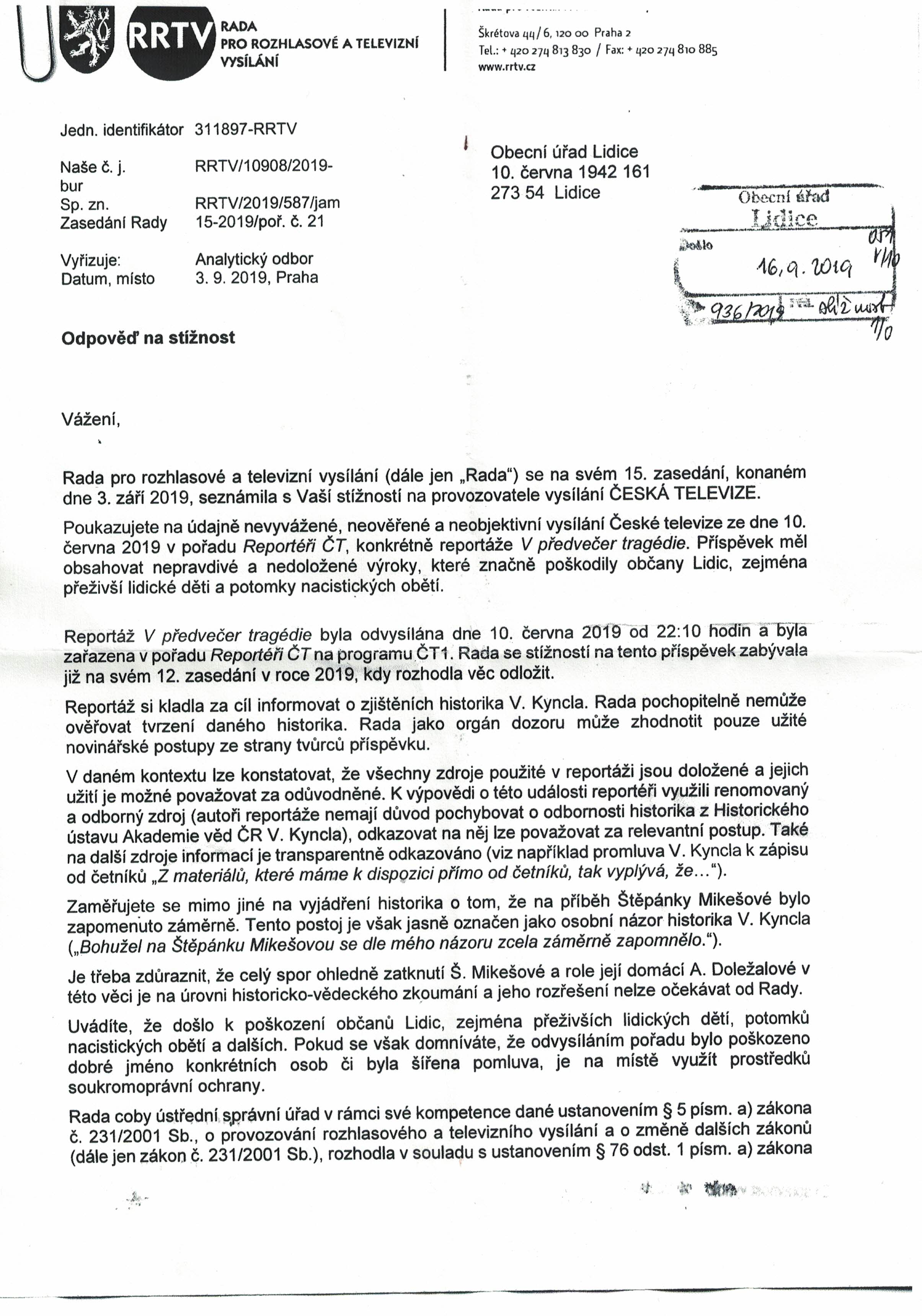 Zveřejnění dopisů a dokumentů ke stížnosti vedené ze strany Obecního úřadu Lidice, směřované k programovému řediteli ČT Milanovi Fridrichovi a následné komunikace ...